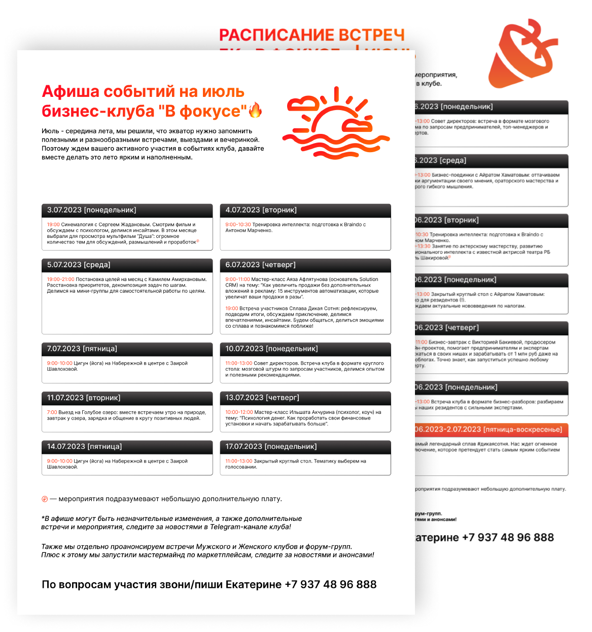У нас активная и насыщенная жизнь: тематические мастер-классы, тренинги на актуальные темы и трасформационные игры, поездки, а также встречи, на которых мы делимся волнующими вопросами, обсуждаем, помогаем в решении и поддерживаем друг друга!